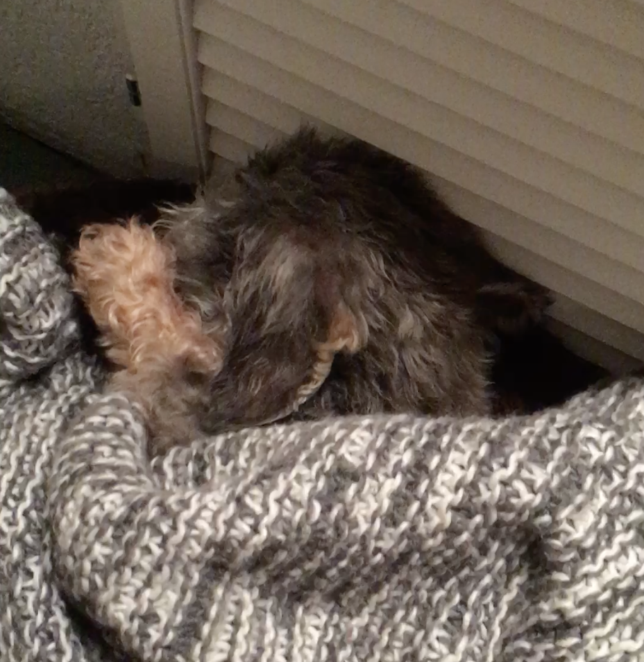 We zijn nu een week verder en Teckel Teun slaapt als een roos, iedere avond opnieuw als een baby ingebakerd in zijn dekentje. Mijn wallen verdwijnen langzaam.